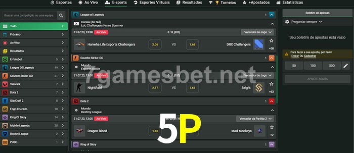 O 5P oferece uma grande seleção de opções de apostas em e-sports com probabilidades competitivas